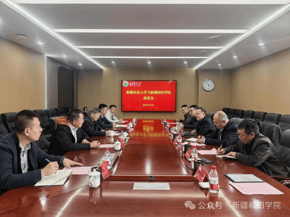 2025年10月17日上午,学校党委副书记、校长王志坚(右三)一行在新疆农业大学调研交学习,与新疆农业大学党委常委、副校长綦群高(左三)亲切交流