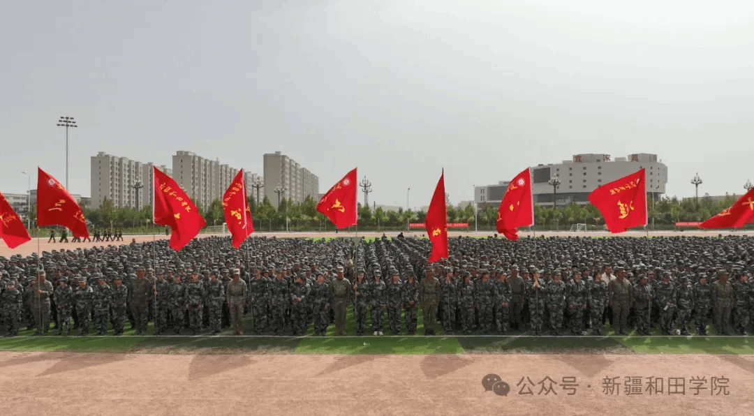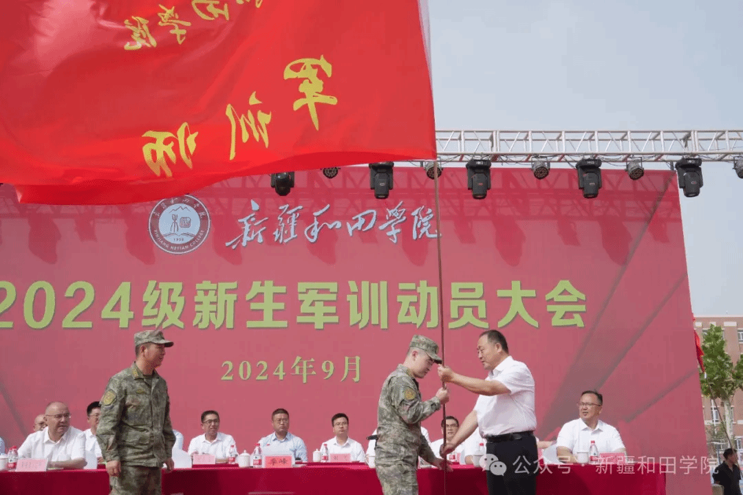 仪式上,学校党委书记、军训师政委季峰向和田军分区参谋部少校参谋王欣颁授军训师旗。
