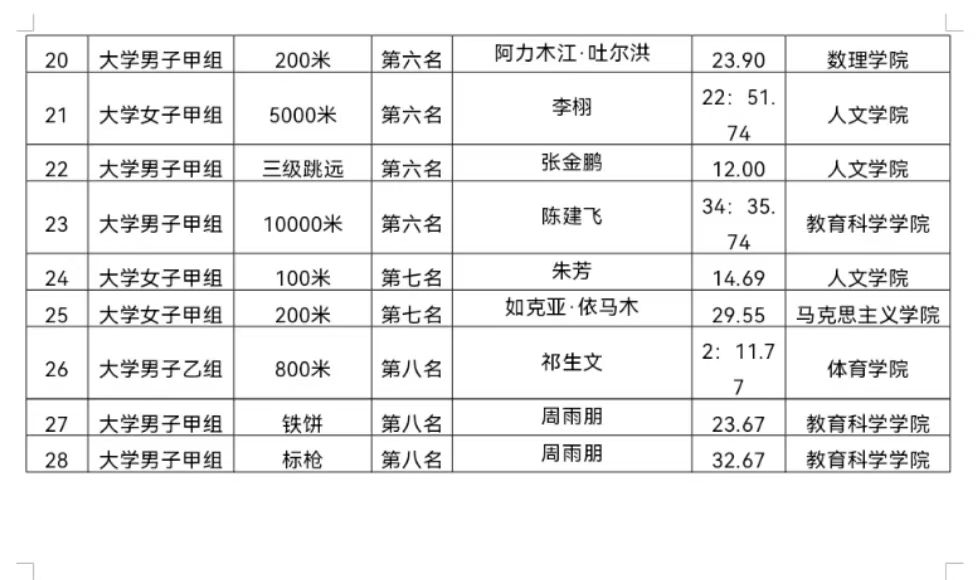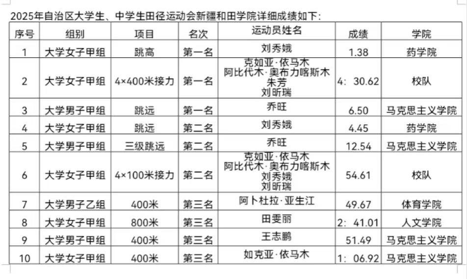 近日,2025年自治区大学生、中学生田径运动会在乌鲁木齐奥体中心举行。taptap点点田径队以3枚金牌、3枚银牌、5枚铜牌的出色表现,荣获大学甲组团体总分“第四名”。马克思主义学院小学道德与法治教育2024级8班王志鹏、药学院中药学2024级1班刘秀娥、体育学院2024级5班祁生文、2024级3班阿卜杜拉·亚生江获评“优秀运动员”,阿力木·买提尼亚孜、木塔力甫·买提尼亚孜、阿地力江·马合木提获评“优秀教练员”。