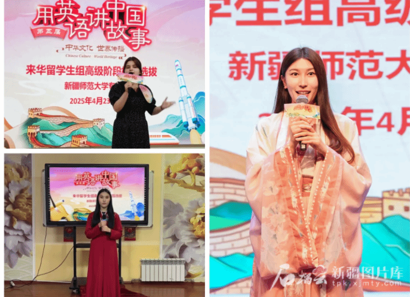 4月23日,在新疆师范大学承办的第五届“用英语讲中国故事大会”来华留学生组高级阶段校园选拔专场活动中,选手进行精彩展示。图片由新疆师范大学提供