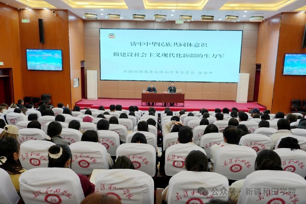 为进一步引导广大师生铸牢中华民族共同体意识,11月12日,自治区政协港澳台侨和外事委员会主任张华中一行来校交流,并以“铸牢中华民族共同体意识 做中国式现代化新疆实践的生力军”为题,为师生讲授了一堂立意高远、内涵丰富的思政课。学校党委常委、副院长张增田主持讲座。 讲座中,张华中与师生分享思想感悟。他深情回顾了在和田墨玉县三年的驻村经历,并从四个维度展开论述,为师生们带来一场思想盛宴。他以毛主席“万方乐奏有于阗”...